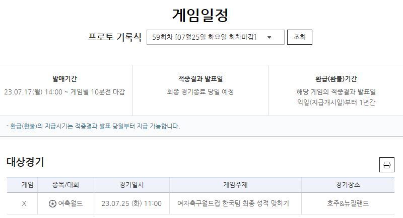 -2023 FIFA 여자월드컵 대한민국대표팀 최종 성적 맞히는 프로토 기록식 59회차, 17일(월) 오후 2시 발매 개시