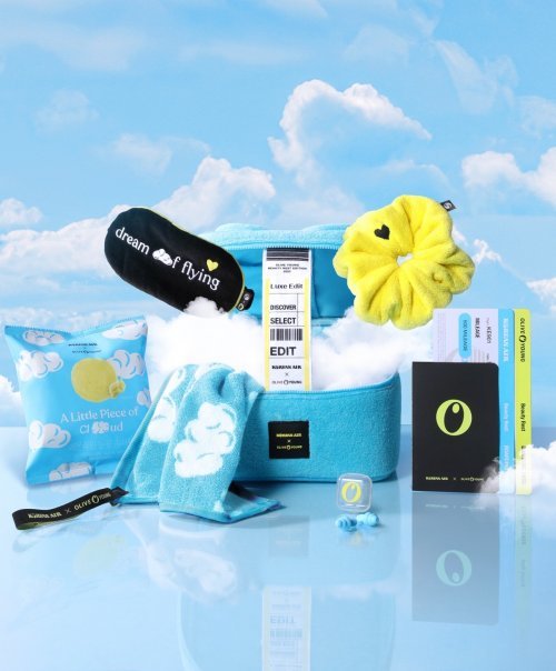 파우치는 목욕가운이나 타월에 주로 사용하는 테리클로스(보풀보풀하게 짠 면직물) 소재의 뷰티 박스로 제작해 여행 시 실용성과 트렌디함을 모두 갖췄다. 디자인은 비행을 연상시키는 하늘과 구름을 모티브로 대한항공의 브랜드 컬러인 청자색과 올리브영 럭스 에디트 고유의 레몬색을 적절히 더했다.