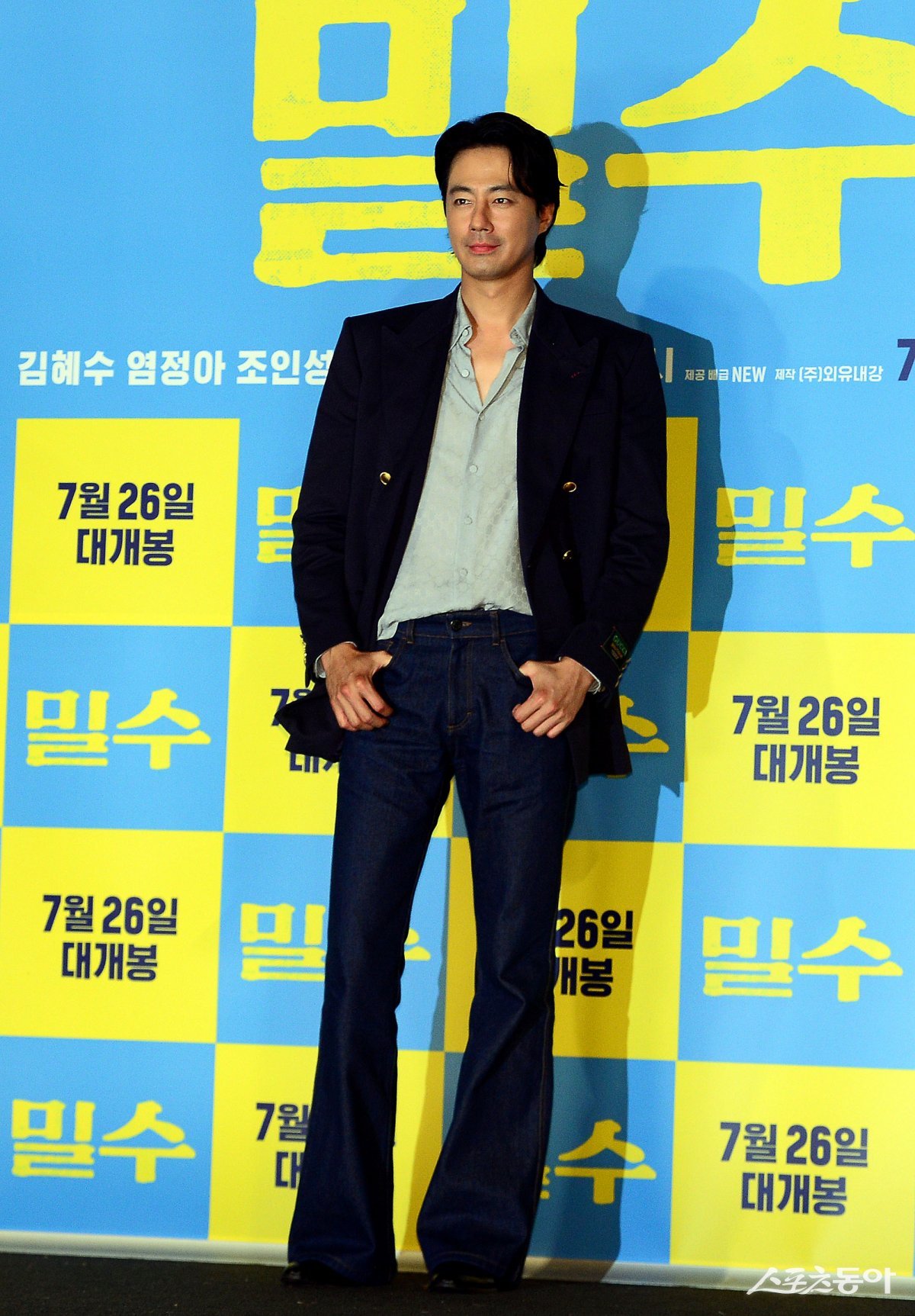 배우 조인성이 18일 서울 용산구 CGV 용산아이파크몰에서 열린 영화 ‘밀수’ 언론 시사회 및 기자 간담회에 참석해 카메라를 향해 포즈를 취하고 있다.