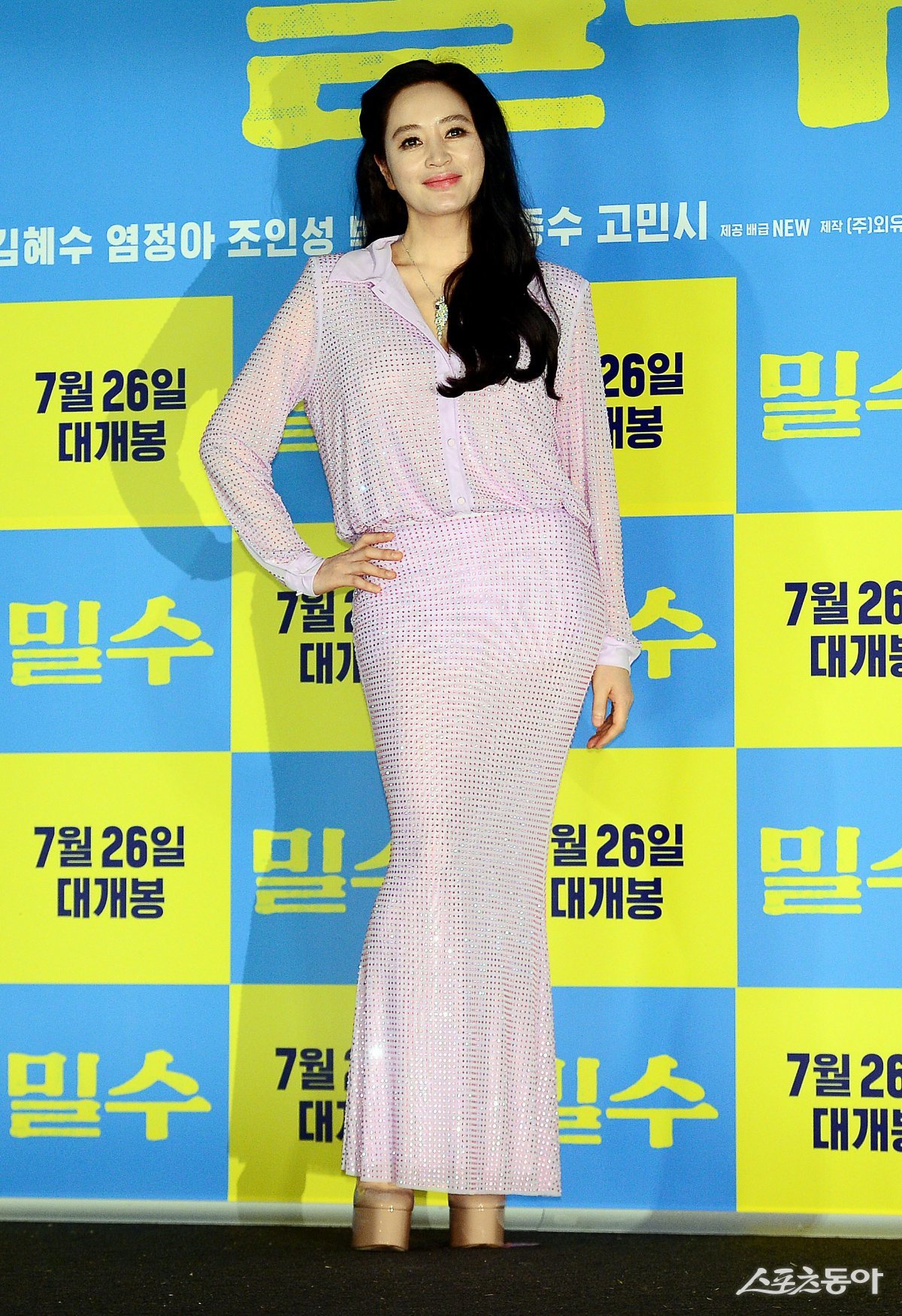 배우 김혜수가 18일 서울 용산구 CGV 용산아이파크몰에서 열린 영화 ‘밀수’ 언론 시사회 및 기자 간담회에 참석해 카메라를 향해 포즈를 취하고 있다.