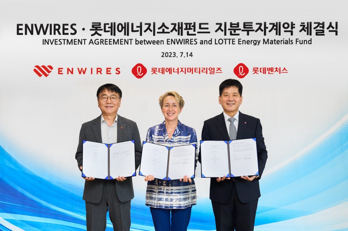 롯데벤처스 대표, 올가 부르착 엔와이어즈 대표, 김연섭 롯데에너지머티리얼즈 대표(왼쪽부터)가 지분투자계약을 체결하고 있다.