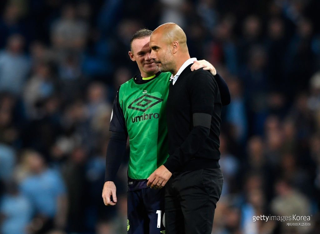 2017년 8월 21일. 에티하드 스타디움에서 열린 맨시티와 에버턴의 경기에서 대화를 나누는 루니(왼쪽)와 과르디올라. 사진=게티이미지코리아.