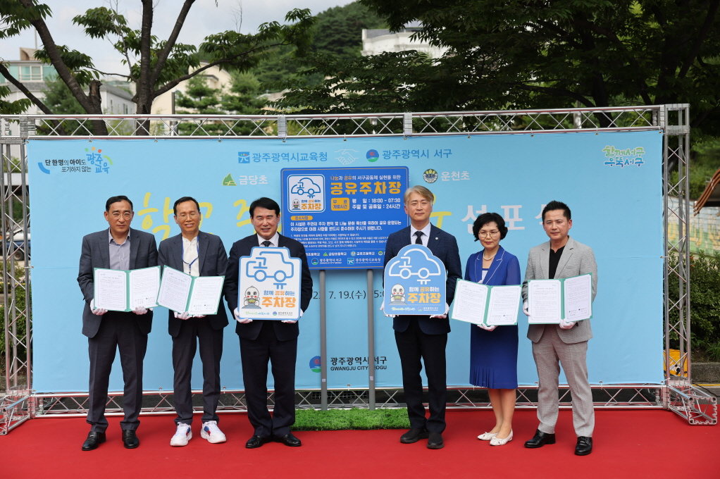 광주시교육청이 19일 금당초등학교에서 지역주민의 편의를 위해 ‘학교 주차장 공유 선포식’을 진행했다.이번 선포식은 시교육청이 지난 6월12일 서구와 맺은 지역-학교 간 상생·협력 공유 활성화를 위한 업무협약의 첫 성과이다. 앞으로 광천초 21면, 금당초 21면, 금호초 34면, 운천초 35면 총 4개 초등학교 주차장 111면을 지역주민들과 공유한다. 이 자리에는 이정선 교육감, 김이강 서구청장을 비롯해 광주광천초 박수정 교장, 금당초 정병석 교장, 금호초 조명철 교장, 운천초 박선영 교장 등이 참석했다.