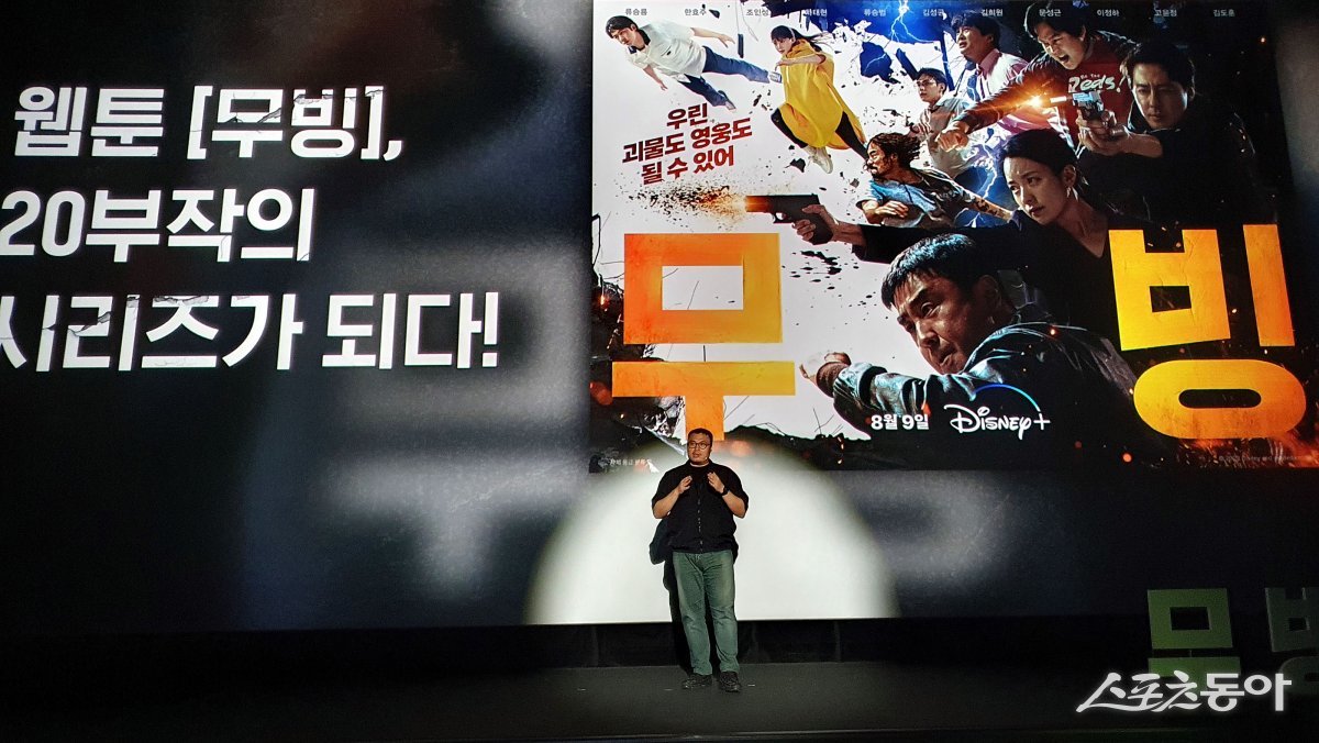 20일 서울 용산구 CGV 아이파크몰에서 디즈니+ 오리지널 시리즈 ‘무빙’ Creators Talk 행사가 열렸다. 원작 웹툰 강풀 작가가 작품에 대해 설명하고 있다.