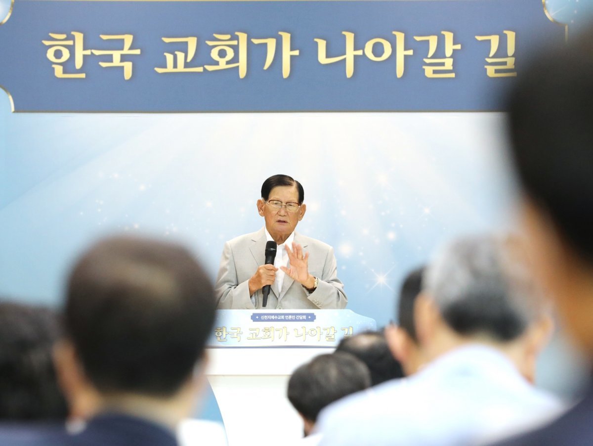 이만희 총회장이 지난 19일 경기도 가평군 청평면 신천지 평화연수원에서 열린 기자간담회에서 ‘한국교회에 나아갈 길’에 대한 주제로 인사말을 하고 있다. 사진제공ㅣ신천지예수교회