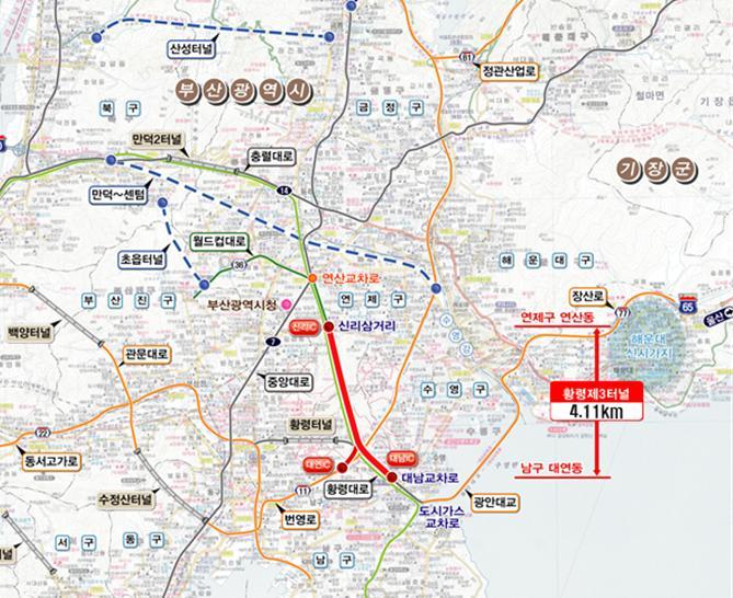 총연장 4.11㎞의 ‘황령3터널 도로개설사업’은 연제구 연산동 신리삼거리와 남구 대연동 황령대로를 연결하는 총사업비 3696억원 규모의 도로개설 사업이다.