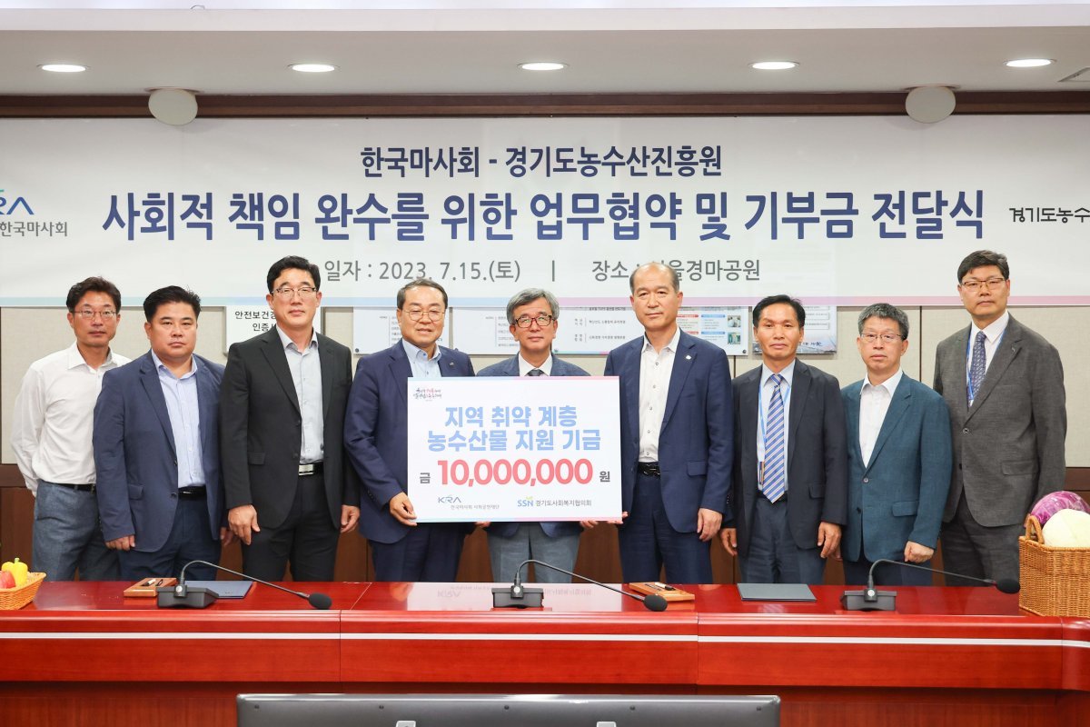 한국마사회는 15일 경기도농수산진흥원과 사회적 책임 완수를 위한 업무협약(MOU)을 맺고 경기도사회복지협의회에 지역 취약계층을 위한 기부금을 전달했다. 양 기관은 협약에 따라 경마 이미지 개선 및 지역 주민 경마공원 방문 활성화, 경기 지역 농수산물 홍보 및 판매 촉진 등 두 기관의 고유사업 추진 및 사회적 기여로 윈-윈(win-win) 효과를 기대하고 있다. MOU 체결에 이어 한국마사회는 사회공헌재단 기금 1000만 원을 출연해 경기도 지역 취약계층 대상 농수산물 지원을 위해 쓰도록 경기도사회복지협의회에 전달했다.