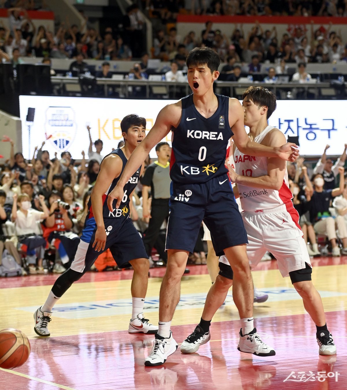 23일 서울 잠실학생체육관에서 열린 한국 남자농구 대표팀과 일본 대표팀 평가전에서 한국 하윤기가 덩크슛을 성공시킨 후 포효하고 있다.