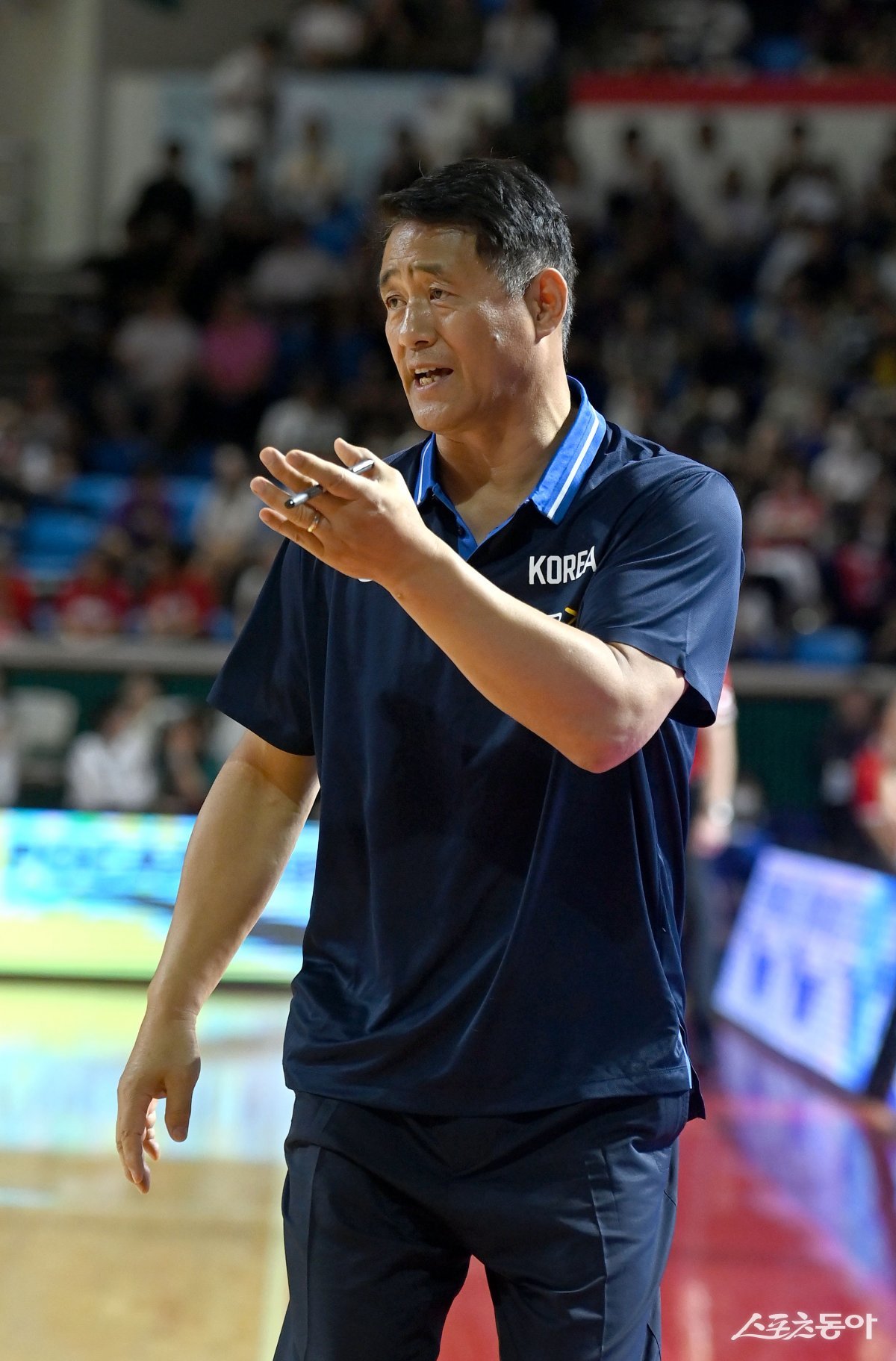 23일 서울 잠실학생체육관에서 열린 한국 남자농구 대표팀과 일본 대표팀 평가전에서 한국 추일승 감독이 작전 지시를 하고 있다.