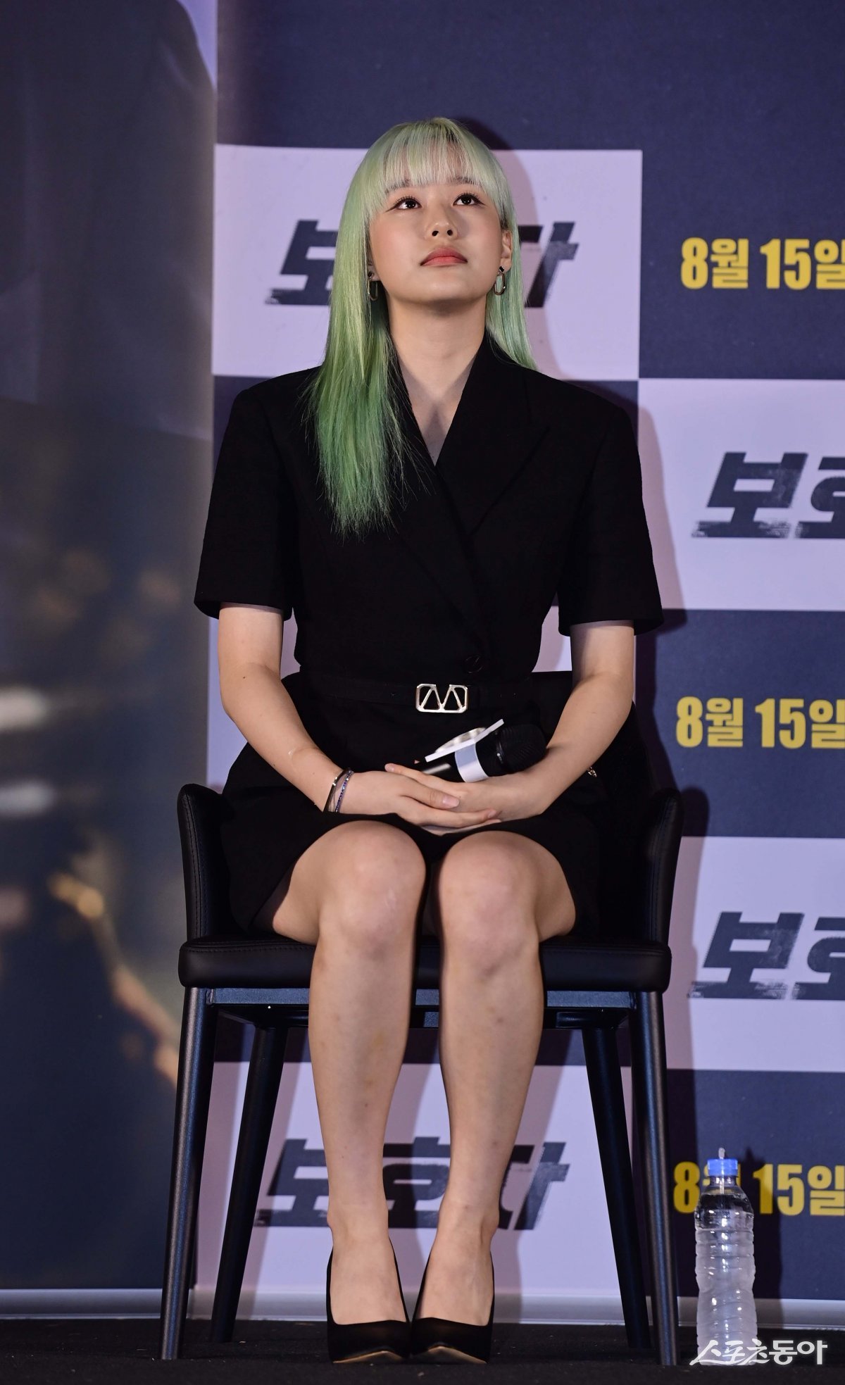 배우 박유나가 24일 서울 용산구 CGV용산아이파크몰점에서 열린 영화 ‘보호자’ 제작보고회에서 동료의 인사말을 듣고 있다.