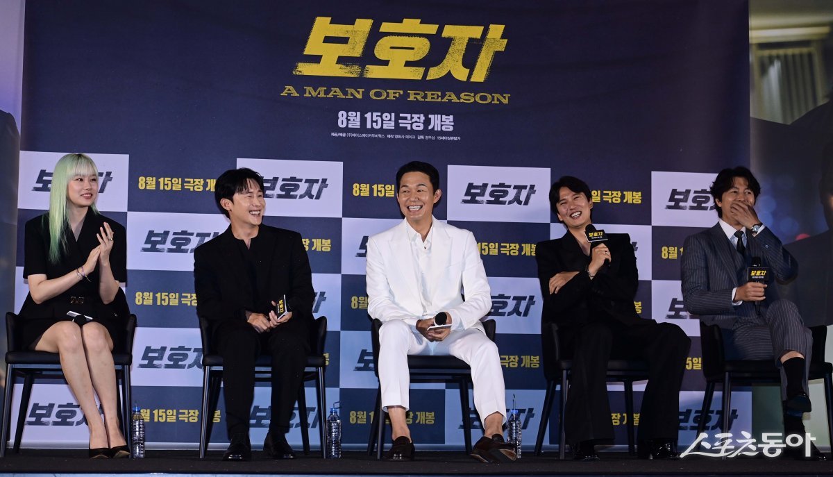 배우 박유나, 김준한, 김남길, 감독 겸 배우 정우성이 24일 서울 용산구 CGV용산아이파크몰점에서 열린 영화 ‘보호자’ 제작보고회에서 박성웅의 삼행시에 웃고 있다.