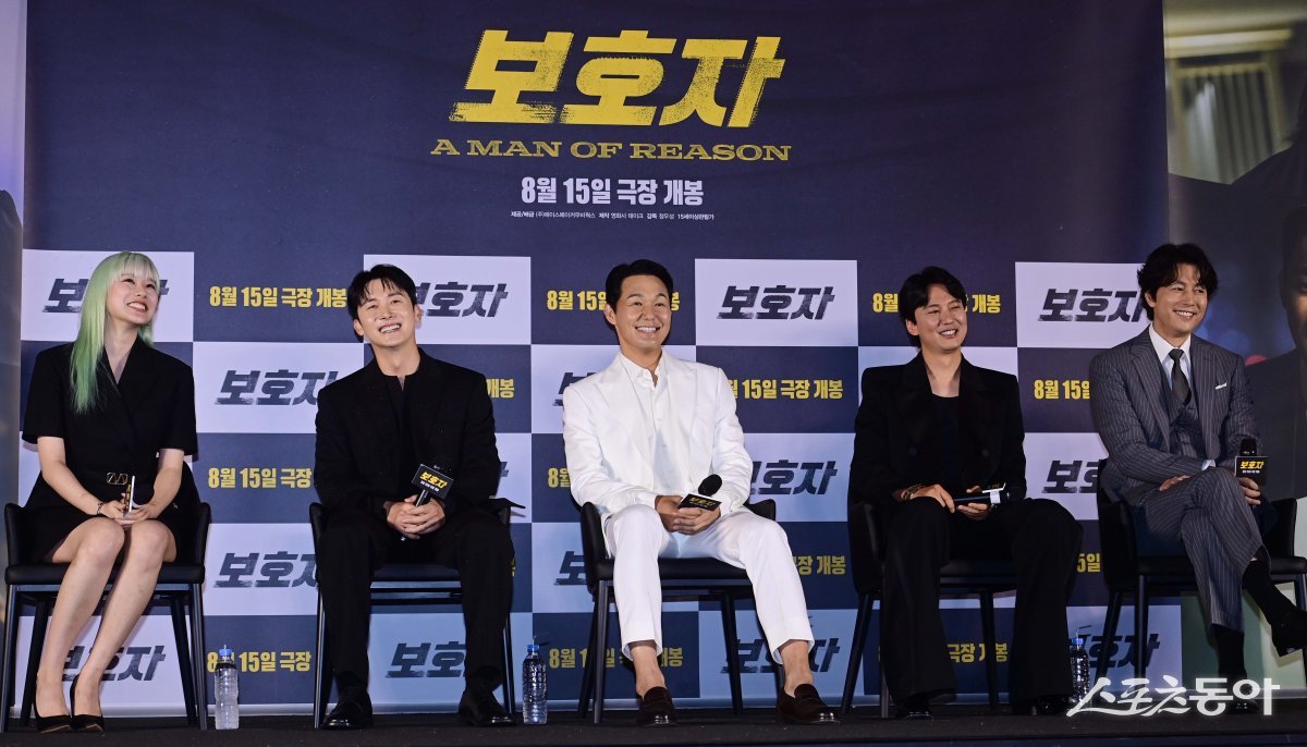 배우 박유나, 김준한, 박성웅, 김남길, 감독 겸 배우 정우성이 24일 서울 용산구 CGV용산아이파크몰점에서 열린 영화 ‘보호자’ 제작보고회에서 MC의 질문을 들으며 웃고 있다.