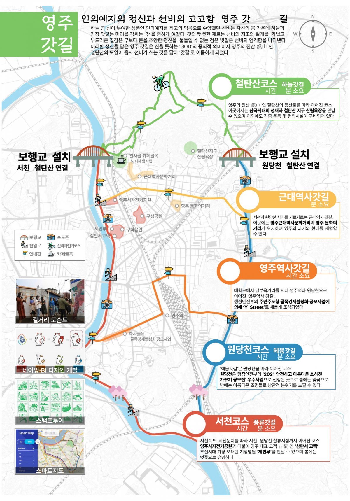 영주갓길은 ▲서천부터 원당천 합류까지의 ‘풍류갓길’(6.3km) ▲원당천을 따라가는 ‘헤윰갓길’(4.7km) ▲철탄산 등산로 이어지는 ‘하늘갓길’(5km) ▲서천과 원당천 사이를 가로지르는 ‘근대역사갓길’(2.3km) ▲영주역과 원당천으로 이어진 ‘영주역사갓길’(3.2km)로 이뤄진 보행로로 총길이는 21.5km이다.