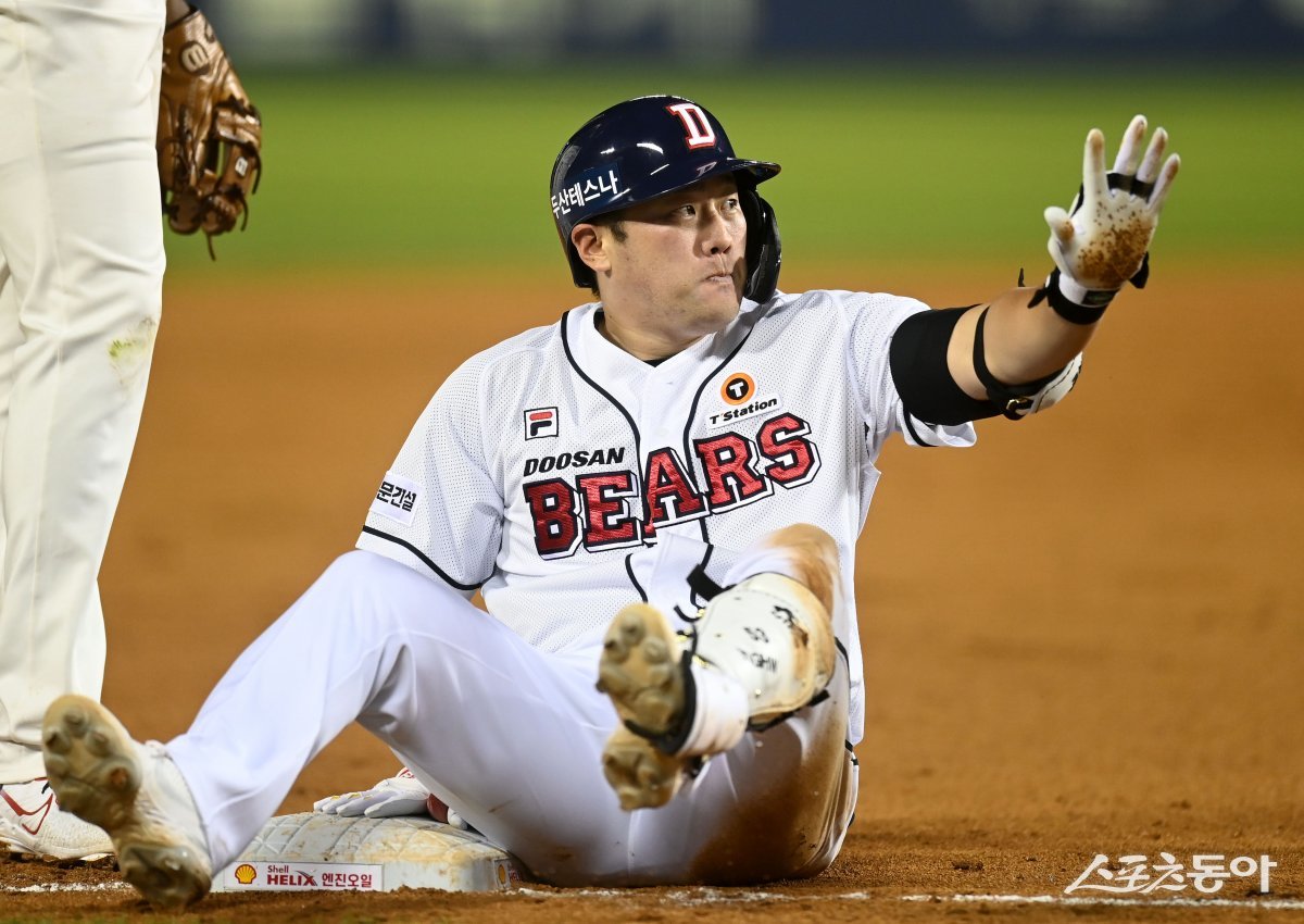 25일 서울 잠실야구장에서 ‘2023 신한은행 SOL KBO리그’ 롯데 자이언츠와 두산 베어스 경기가 열렸다. 5회말 1사 1,2루 두산 양석환이 좌전 안타를 치고 롯데 실책하는 사이 3루까지 달려 세이프 되고 있다.