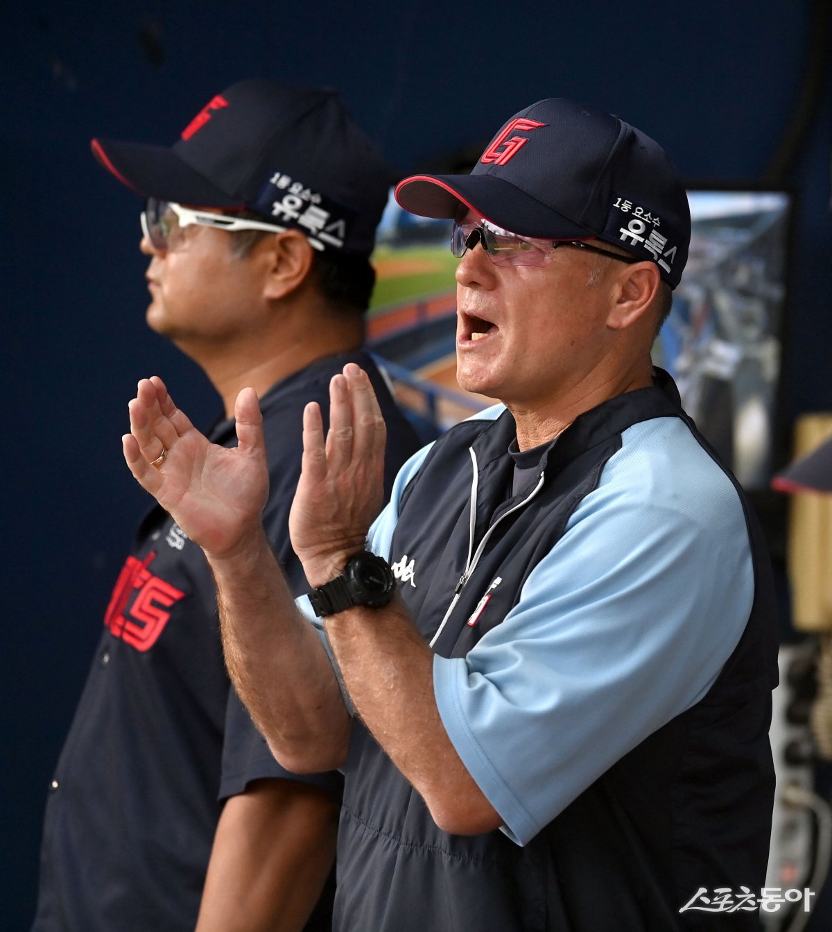 25일 서울 잠실야구장에서 ‘2023 신한은행 SOL KBO리그’ 롯데 자이언츠와 두산 베어스 경기가 열렸다. 롯데 서튼 감독이 선수들을 독려하고 있다.