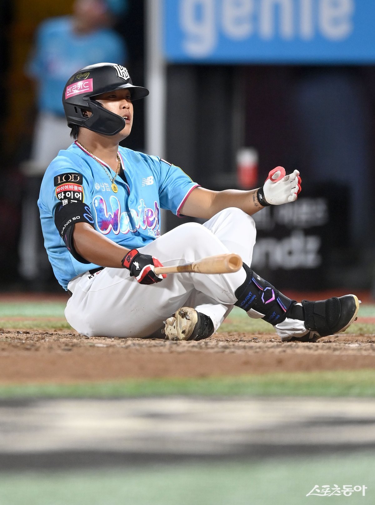 26일 수원KT위즈파크에서 ‘2023 신한은행 SOL KBO리그’ LG 트윈스와 KT 위즈 경기가 열렸다. 5회말 1사 1루 KT 강백호가 스윙을 한 후 중심을 잃고 그라운드에 앉아있다.