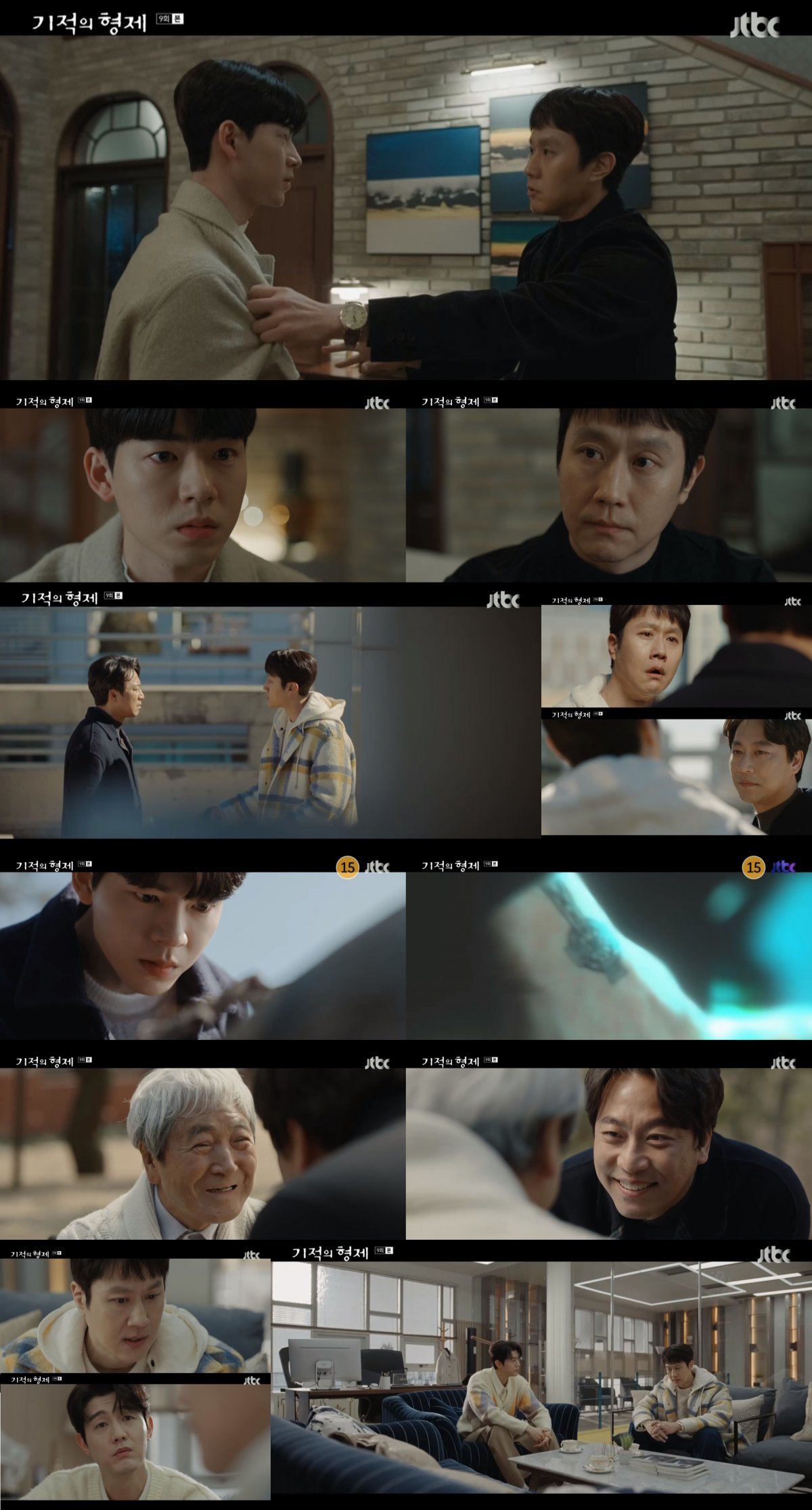 지난 26일 방영된 JTBC 수목드라마 ‘기적의 형제’(극본 김지우, 연출 박찬홍, 제작 MI, SLL) 9회는 예상을 뒤엎는 사건이 발생했다. 동주(정우)의 이름으로 출간된 소설 ‘신이 죽었다’를 쓴 장본인이자, 강산(배현성)의 형인 ‘이하늘’로 추정되는 시신이 발견된 것. 카이(오만석)가 27년 전 실종된 이하늘일 것이란 추론을 뒤엎는 반전 전개가 펼쳐졌다.