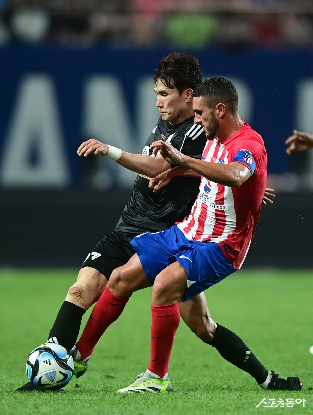 27일 서울월드컵경기장에서 열린 쿠팡플레이 시리즈 1차전 팀 K리그와 아틀레티코 마드리드의 친선경기에서 팀 K리그 한국영이 아틀레티코 마드리드 코케를 수비하고 있다.