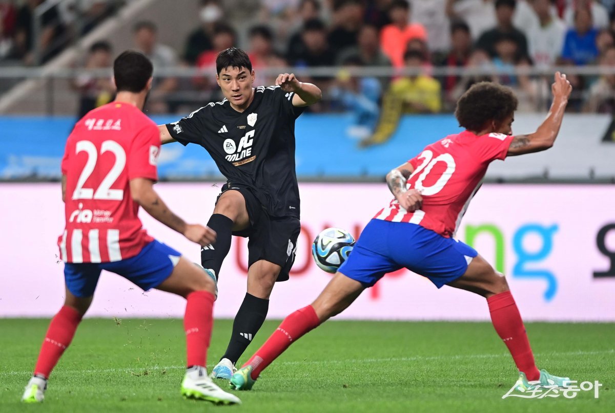 27일 서울월드컵경기장에서 열린 쿠팡플레이 시리즈 1차전 팀 K리그와 아틀레티코 마드리드의 친선경기에서 팀 K리그 주민규가 상대 수비 사이에서 슛을 하고 있다.