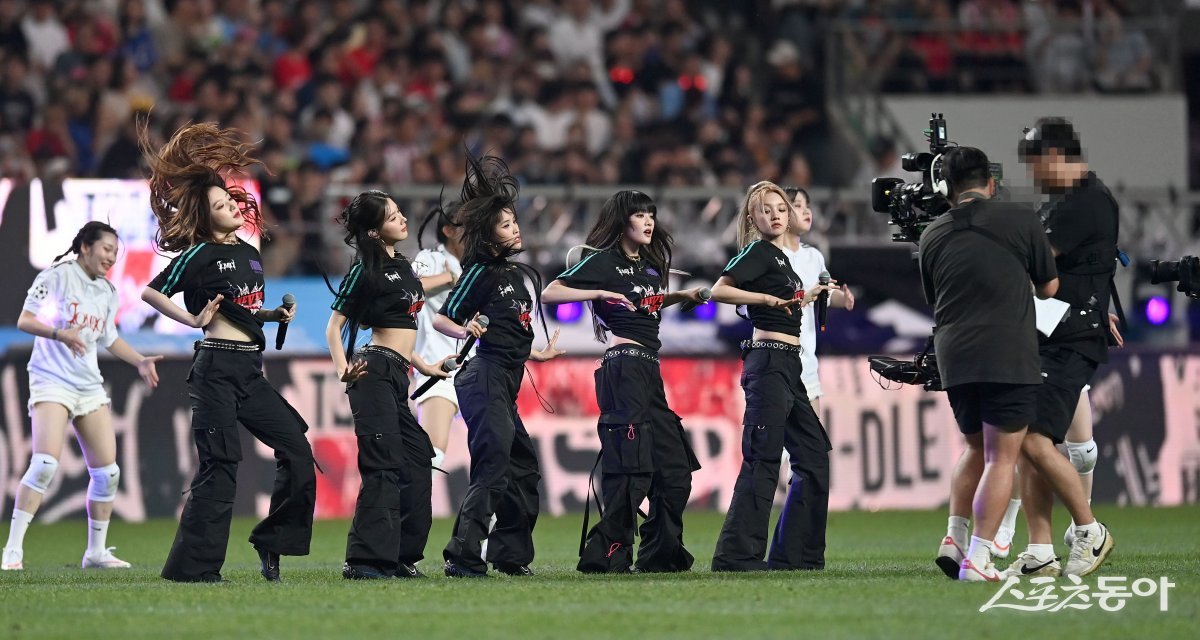 쿠팡플레이 시리즈 1차전 팀 K리그와 아틀레티코 마드리드 경기가 27일 서울월드컵 경기장에서 열렸다. 하프타임 때 여자아이들이 축하 공연을 하고 있다.