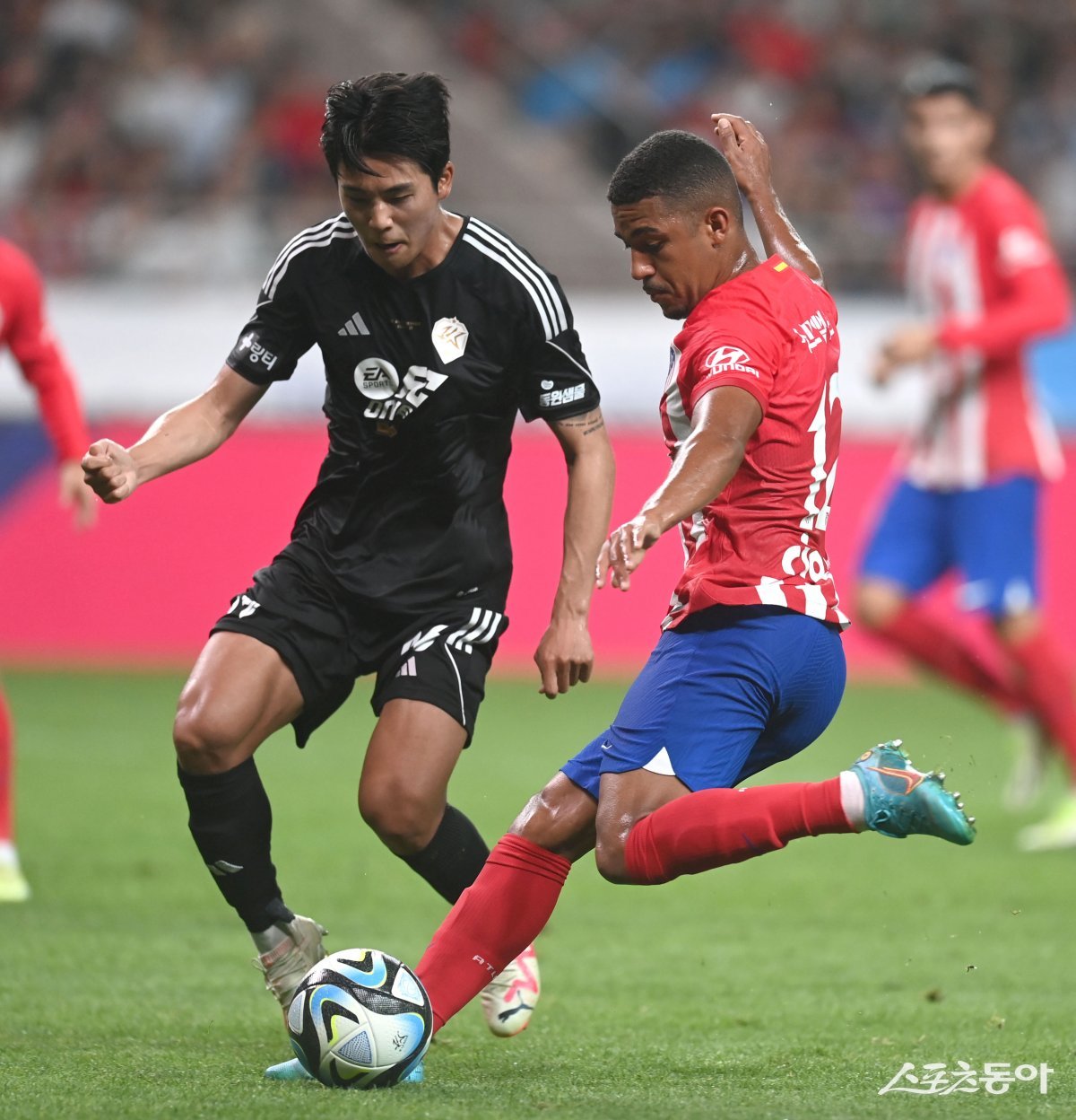 쿠팡플레이 시리즈 1차전 팀 K리그와 아틀레티코 마드리드 경기가 27일 서울월드컵 경기장에서 열렸다. AT 마드리드 사무엘리노가 슛팅을 날리고 있다.
