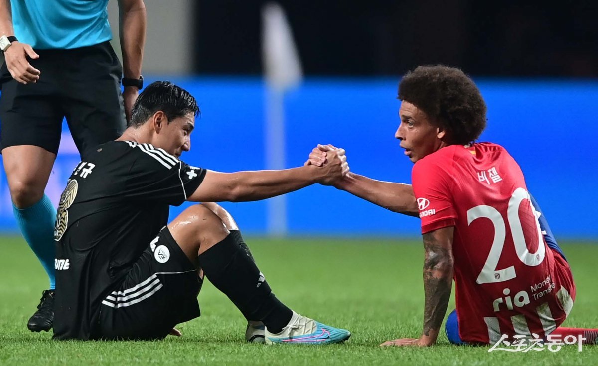 27일 서울월드컵경기장에서 열린 쿠팡플레이 시리즈 1차전 팀 K리그와 아틀레티코 마드리드의 친선경기에서 팀 K리그 주민규와 아틀레티코 비첼이 충돌 후 손을 맞잡으며 일어나고 있다.