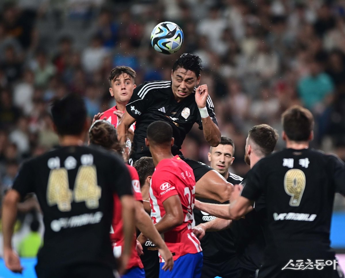 27일 서울월드컵경기장에서 열린 쿠팡플레이 시리즈 1차전 팀 K리그와 아틀레티코 마드리드의 친선경기에서 팀 K리그 정태욱이 헤딩을 하고 있다.