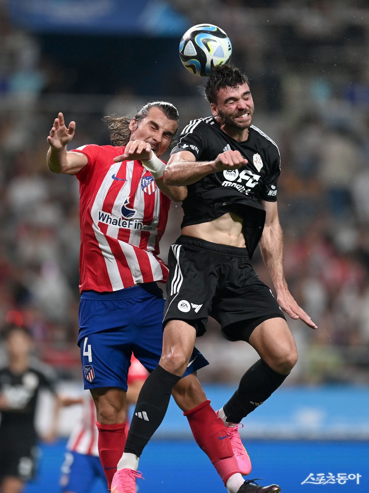 쿠팡플레이 시리즈 1차전 팀 K리그와 아틀레티코 마드리드 경기가 27일 서울월드컵 경기장에서 열렸다. 팀 K리그 나상호가 제카와 AT 마드리드 쇠윈지가 공중볼을 다투고 있다.