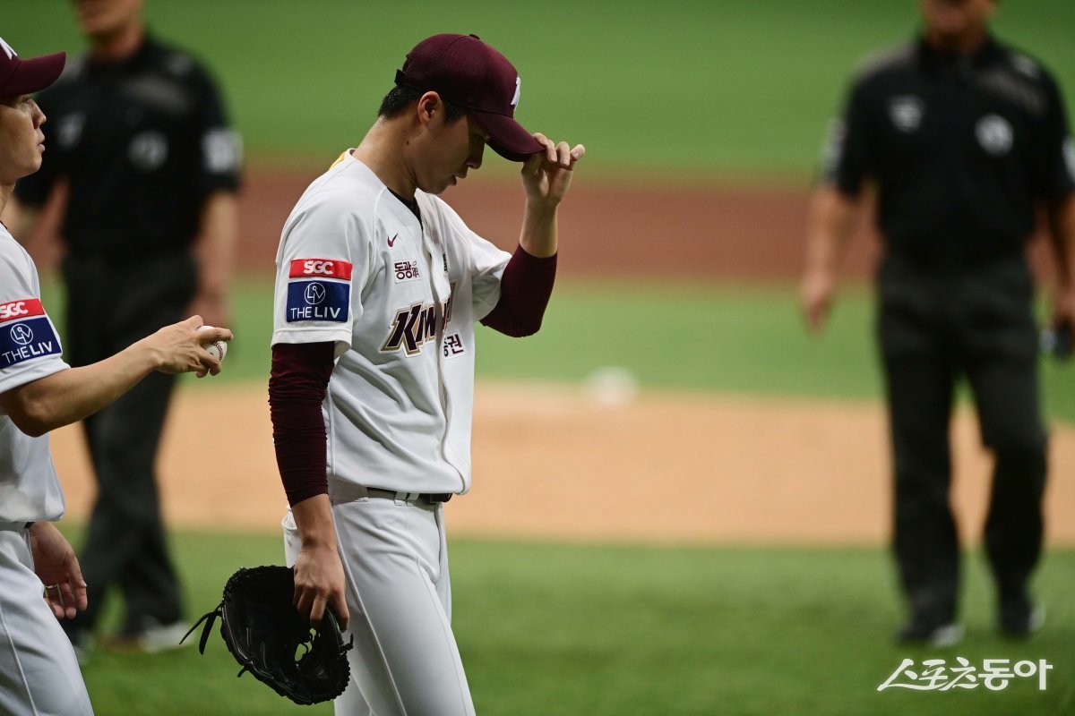30일 서울 고척스카이돔에서 열린 ‘2023 신한은행 SOL KBO리그’ 키움 히어로즈와 삼성 라이온즈의 경기에서 1회초 2사 1, 2루 키움 선발 투수 장재영이 헤드샷 관련 퇴장을 당하고 있다.