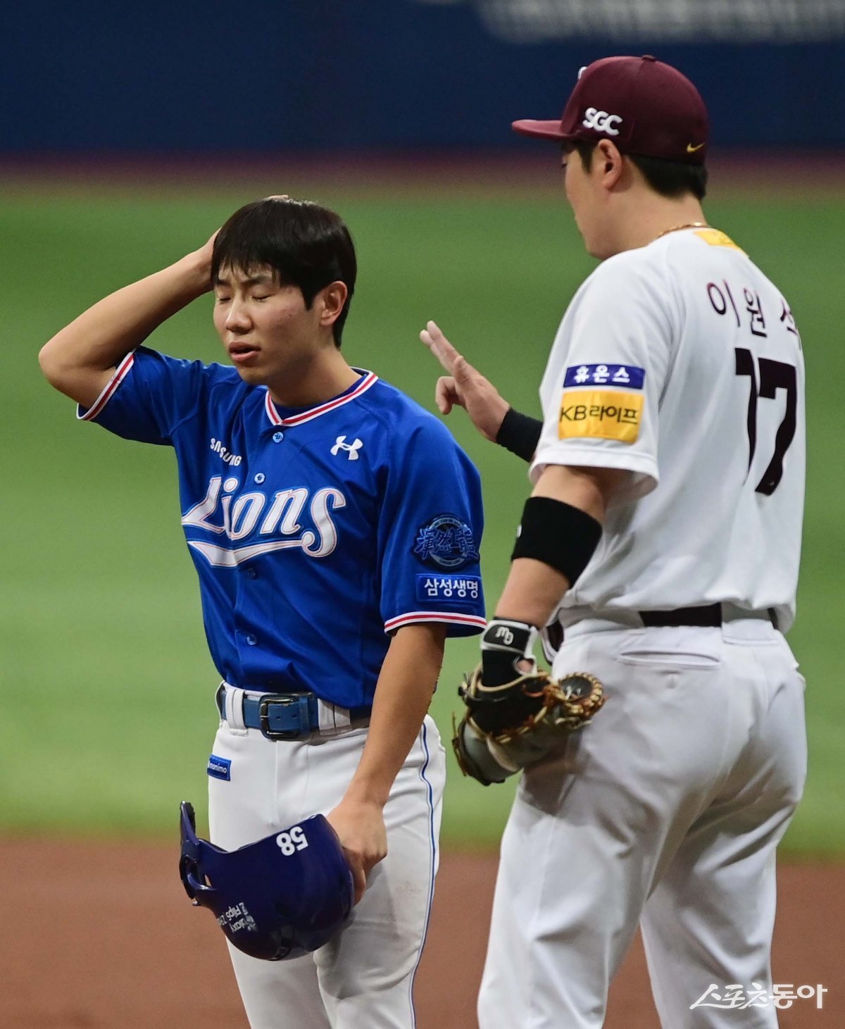 30일 서울 고척스카이돔에서 열린 ‘2023 신한은행 SOL KBO리그’ 키움 히어로즈와 삼성 라이온즈의 경기에서 1회초 2사 1, 2루 키움 선발 투수의 투구된 볼에 머리를 맞은 김지찬이 1루에서 1루수 이원석과 이야기를 하고 있다.