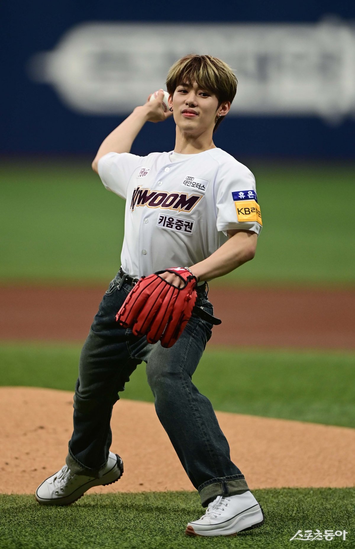 30일 서울 고척스카이돔에서 열린 ‘2023 신한은행 SOL KBO리그’ 키움 히어로즈와 삼성 라이온즈의 경기에 앞서 그룹 TFN 카이리가 시구를 하고 있다.