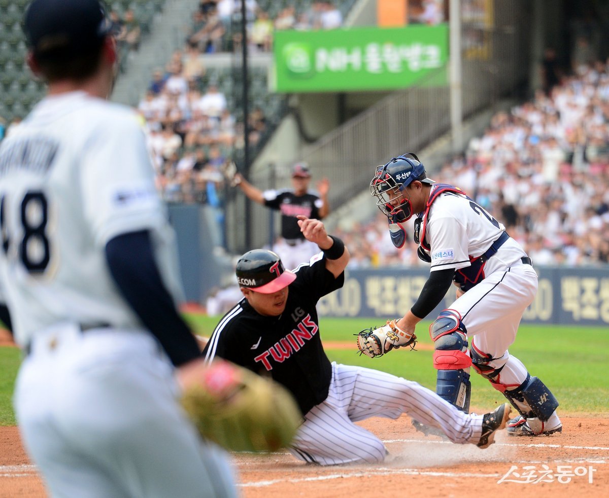 30일 서울 잠실야구장에서 ‘2023 신한은행 SOL KBO리그’ LG 트윈스와 두산 베어스 경기가 열렸다. 2회초 2사 2루 LG 안타 때 2루주자 허도환이 홈으로 달려 세이프 되고 있다.