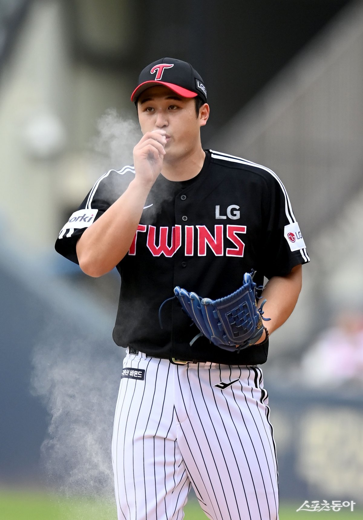 30일 서울 잠실야구장에서 ‘2023 신한은행 SOL KBO리그’ LG 트윈스와 두산 베어스 경기가 열렸다. 선발 투수로 등판한 LG 최원태가 로진을 불고 있다.