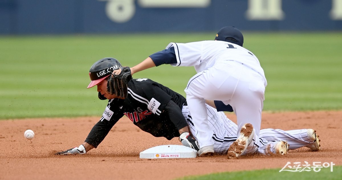 30일 서울 잠실야구장에서 ‘2023 신한은행 SOL KBO리그’ LG 트윈스와 두산 베어스 경기가 열렸다. 1회초 1사 1루 LG 문성주가 2루 도루에 성공하고 있다.