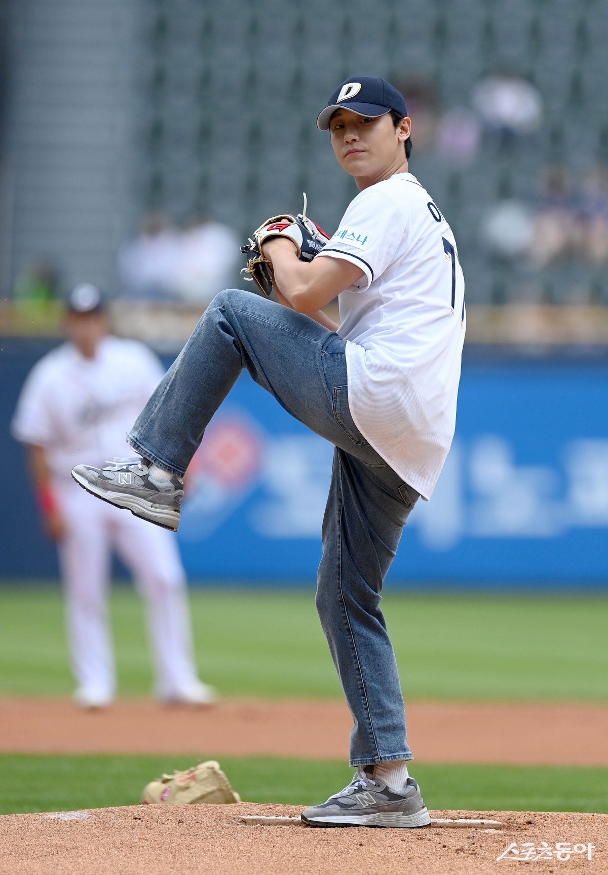 30일 서울 잠실야구장에서 ‘2023 신한은행 SOL KBO리그’ LG 트윈스와 두산 베어스 경기가 열렸다. 배우 이도현이 시구를 하고 있다.