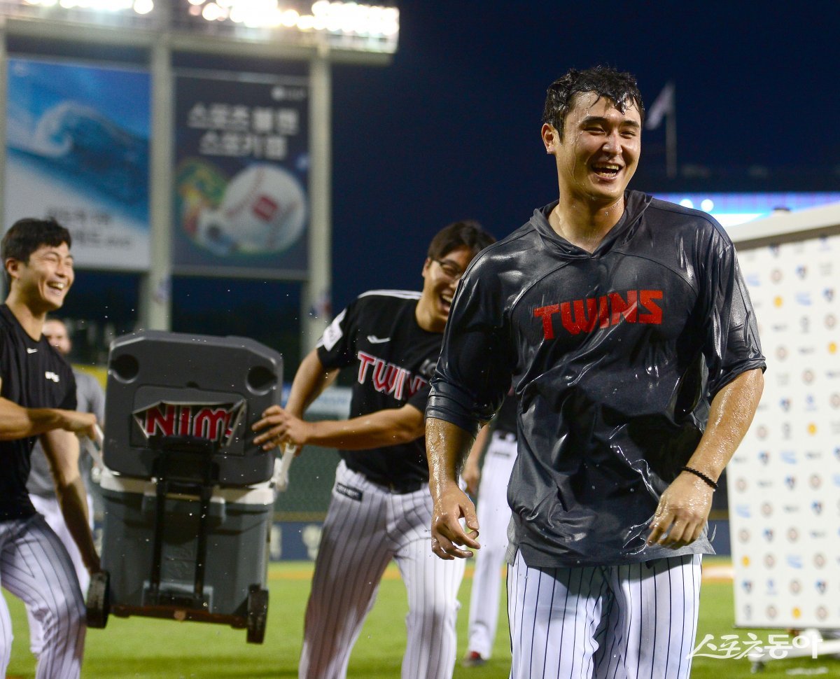 30일 서울 잠실야구장에서 ‘2023 신한은행 SOL KBO리그’ LG 트윈스와 두산 베어스 경기가 열렸다. 선발 투수로 등판해 6이닝 2피안타로 LG 이적 첫 승을 거운 최원태가 물세례를 받고 있다.
