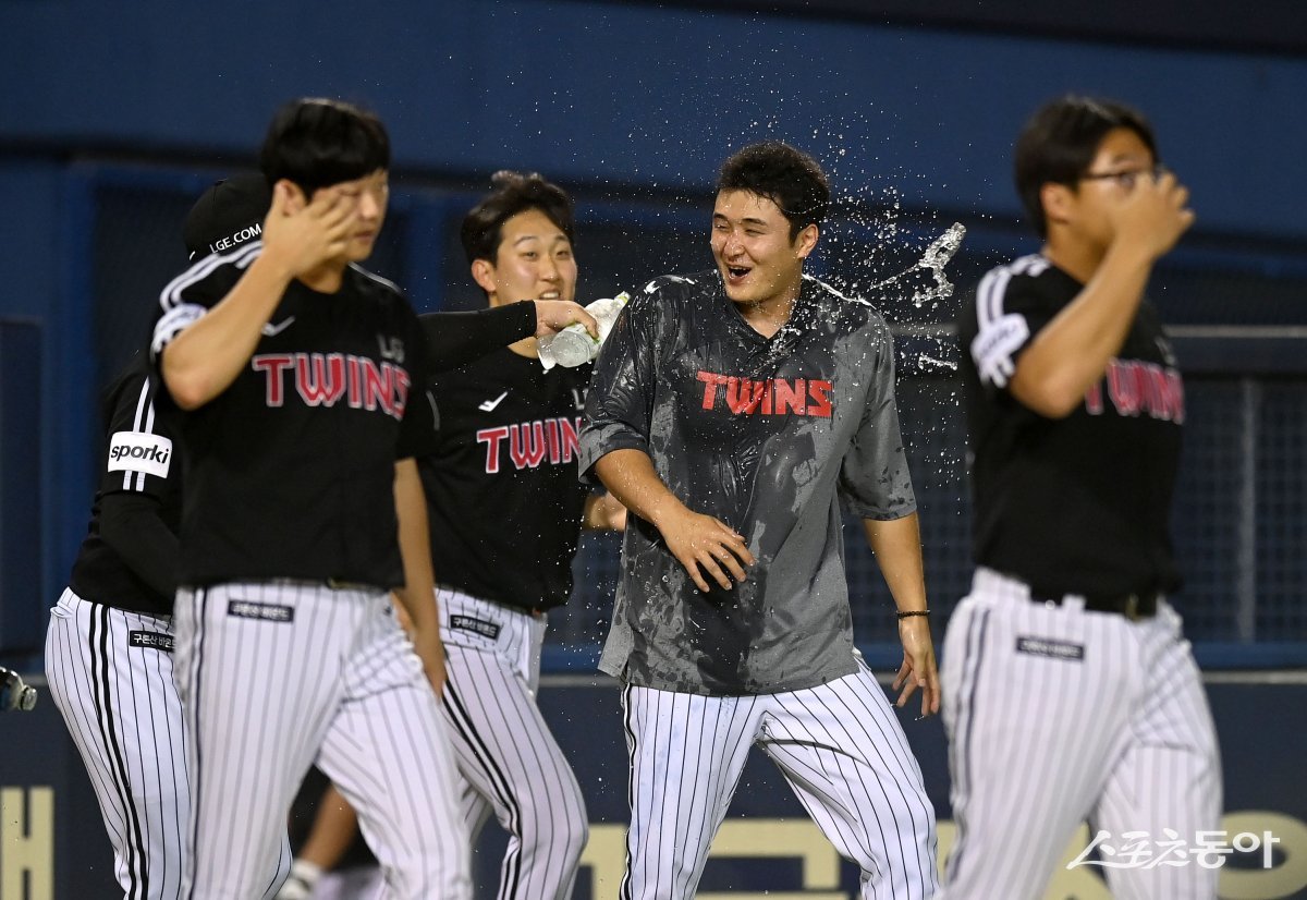 30일 서울 잠실야구장에서 ‘2023 신한은행 SOL KBO리그’ LG 트윈스와 두산 베어스 경기가 열렸다. 선발 투수로 등판해 6이닝 2피안타로 LG 이적 첫 승을 거운 최원태가 물세례를 받고 있다.