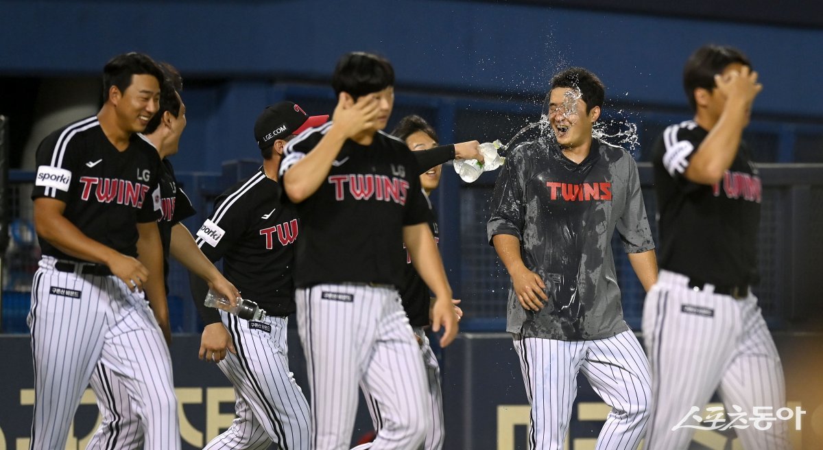 30일 서울 잠실야구장에서 ‘2023 신한은행 SOL KBO리그’ LG 트윈스와 두산 베어스 경기가 열렸다. 선발 투수로 등판해 6이닝 2피안타로 LG 이적 첫 승을 거운 최원태가 물세례를 받고 있다.