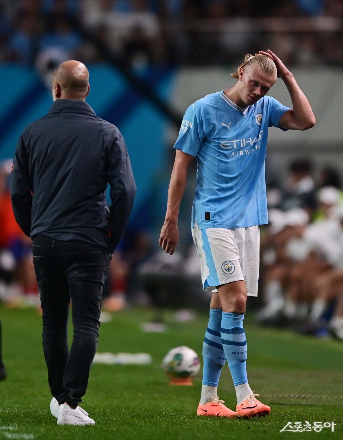 30일 서울월드컵경기장에서 열린 쿠팡플레이 시리즈 2차전 맨체스터 시티 FC와 아틀레티코 마드리드의 친선경기에서 맨체스터 시티 홀란이 후반전에 교체되며 아쉬워하고 있다.