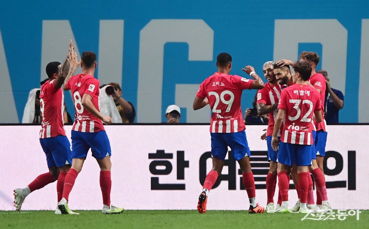 30일 서울월드컵경기장에서 열린 쿠팡플레이 시리즈 2차전 맨체스터 시티 FC와 아틀레티코 마드리드의 친선경기에서 아틀레티코 마드리드 카라스코가 두 번째 골을 성공시킨 후 동료들과 기쁨을 나누고 있다.