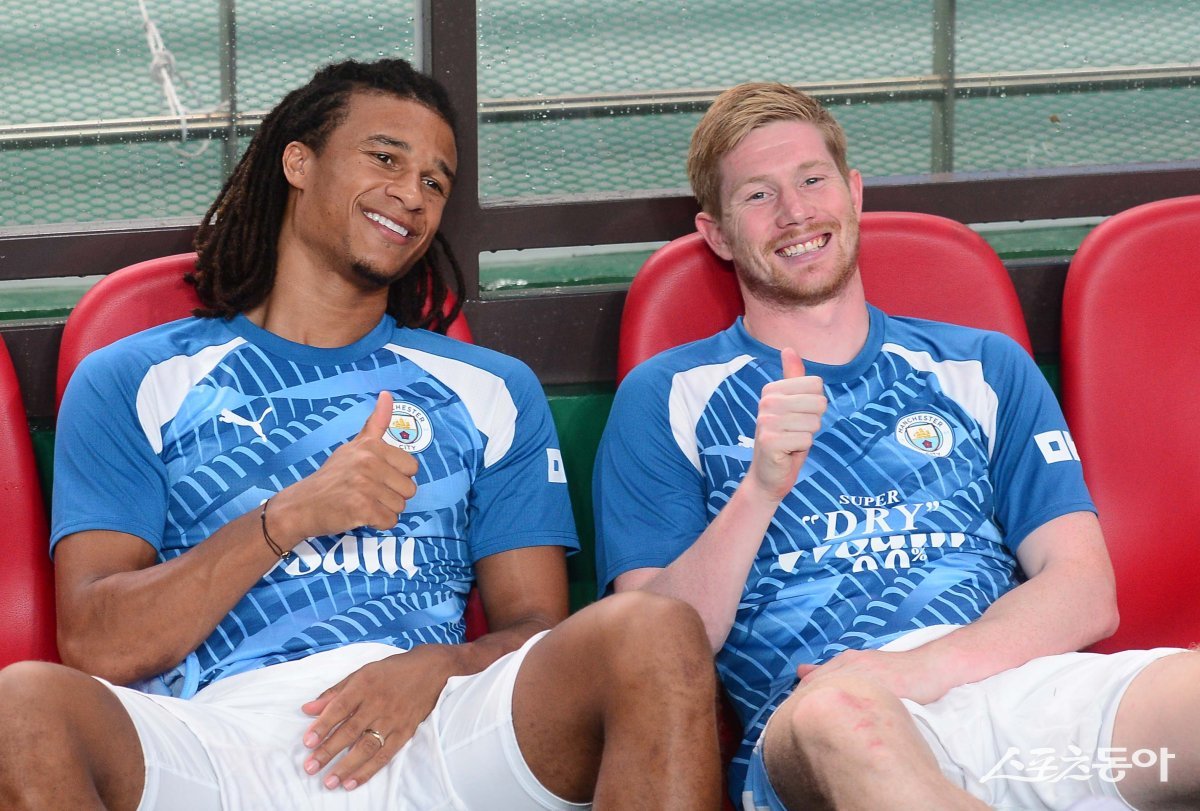 30일 서울월드컵경기장에서 열린 쿠팡플레이 시리즈 2차전 맨체스터 시티 FC와 아틀레티코 마드리드의 친선경기에 앞서 맨체스터 시티 케빈 더 브라위너가 취재진을 향해 포즈를 취하고 있다.