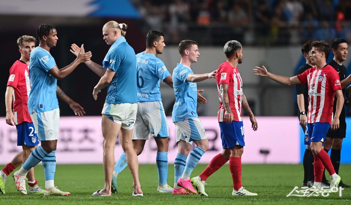 30일 서울월드컵경기장에서 열린 쿠팡플레이 시리즈 2차전 맨체스터 시티 FC와 아틀레티코 마드리드의 친선경기에서 1-2로 패한 맨체스터 시티 홀란이 동료들을 격려하고 있다.