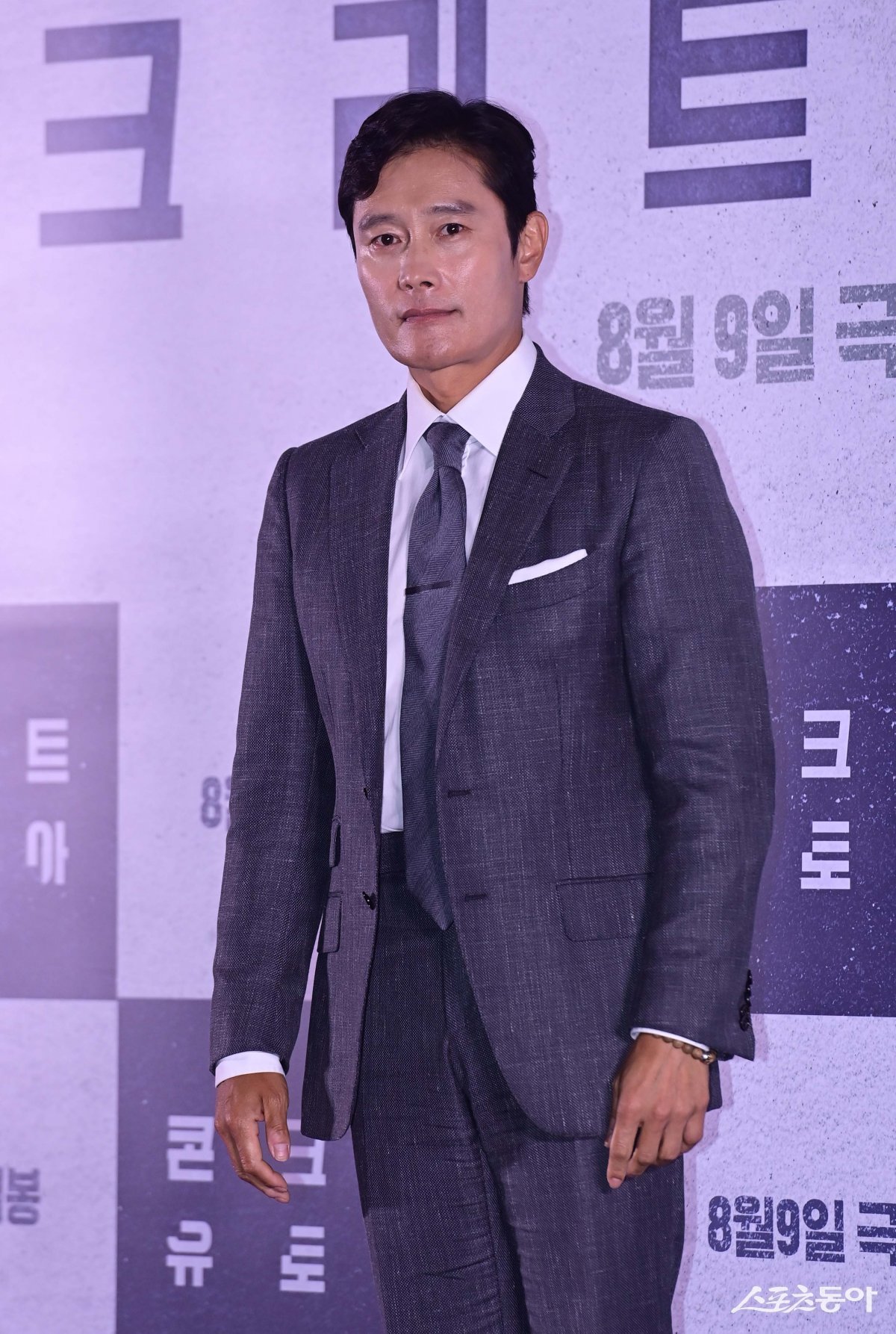 배우 이병헌이 31일 서울 송파구 신천동 롯데시네마 월드타워점에서 열린 영화 ‘콘크리트 유토피아’ 언론시사회에서 포즈를 취하고 있다.
