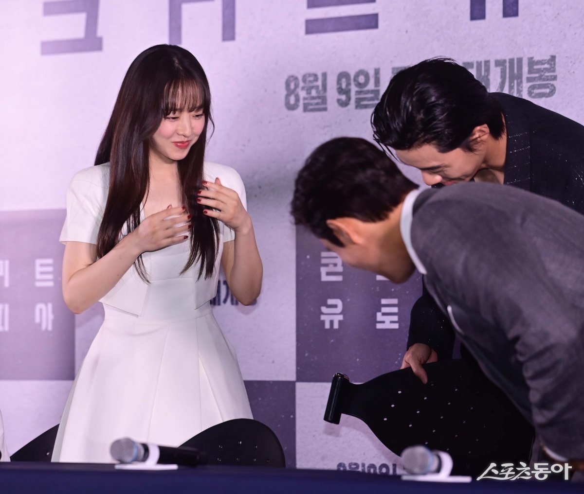 배우 박보영이 31일 서울 송파구 신천동 롯데시네마 월드타워점에서 열린 영화 ‘콘크리트 유토피아’ 언론시사회에서 동료의 실수에 웃고 있다.