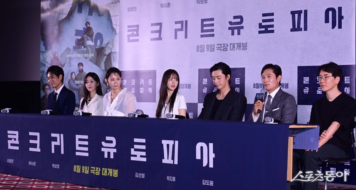 배우 김도윤, 박지후, 김선영, 박보영, 박서준, 이병헌, 감독 엄태화가 31일 서울 송파구 신천동 롯데시네마 월드타워점에서 열린 영화 ‘콘크리트 유토피아’ 언론시사회에서 인사말을 하고 있다.