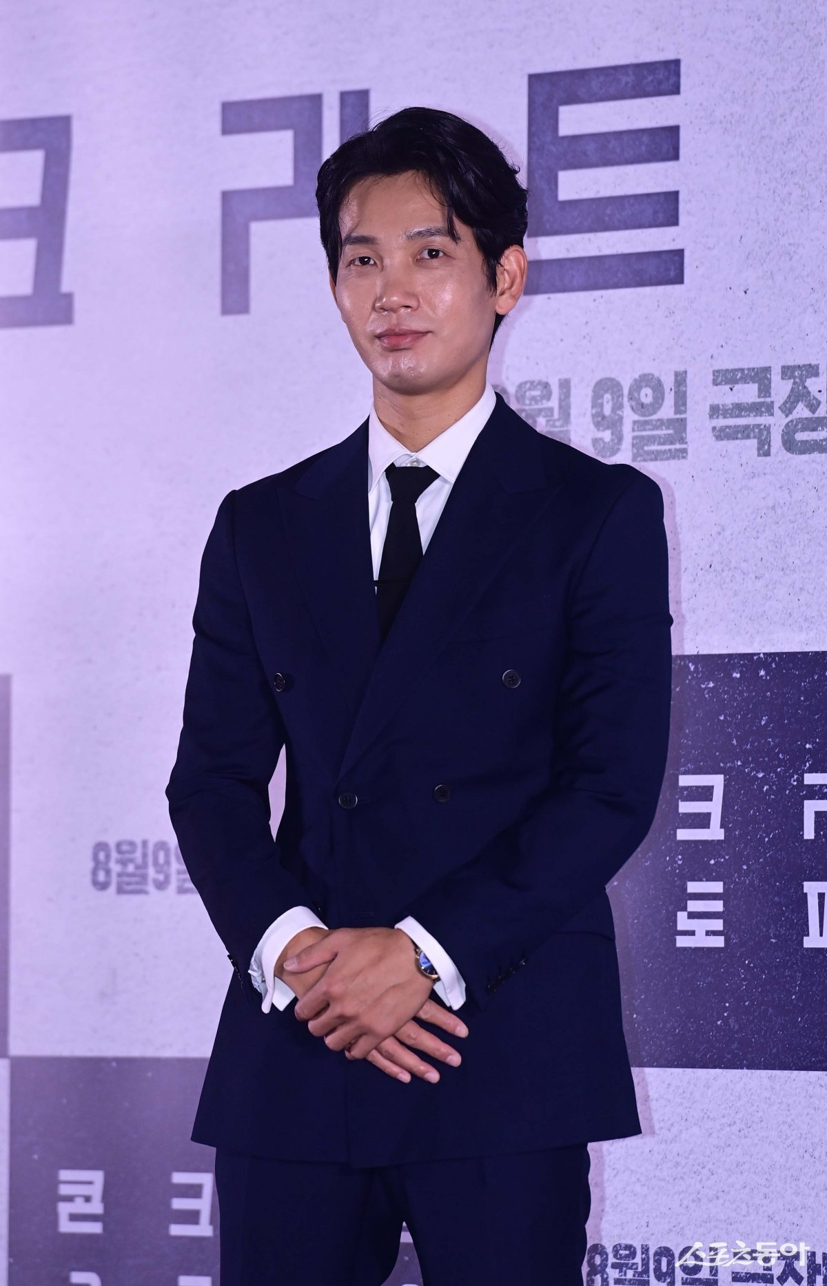 배우 김도윤이 31일 서울 송파구 신천동 롯데시네마 월드타워점에서 열린 영화 ‘콘크리트 유토피아’ 언론시사회에서 포즈를 취하고 있다.