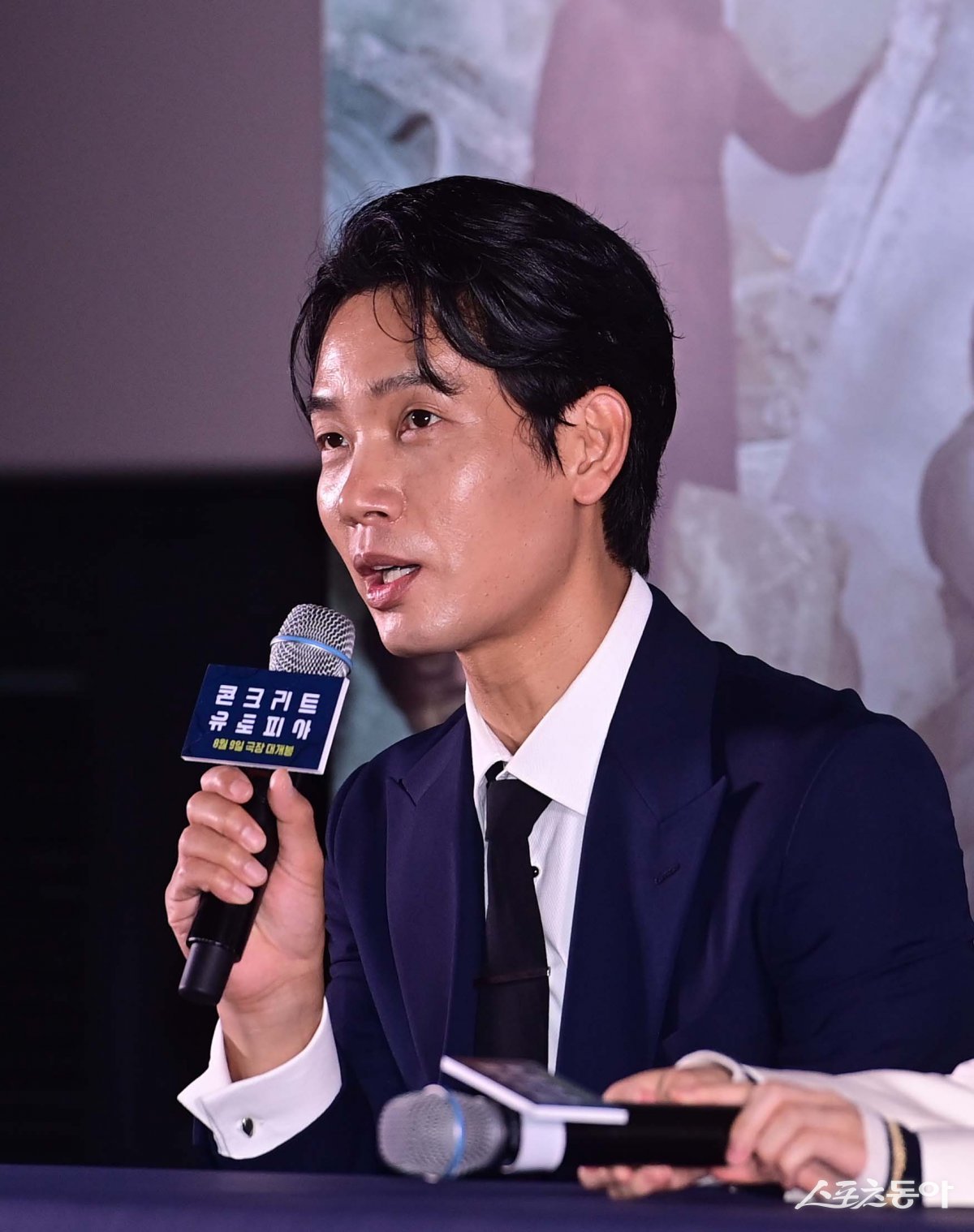배우 김도윤이 31일 서울 송파구 신천동 롯데시네마 월드타워점에서 열린 영화 ‘콘크리트 유토피아’ 언론시사회에서 인사말을 하고 있다.