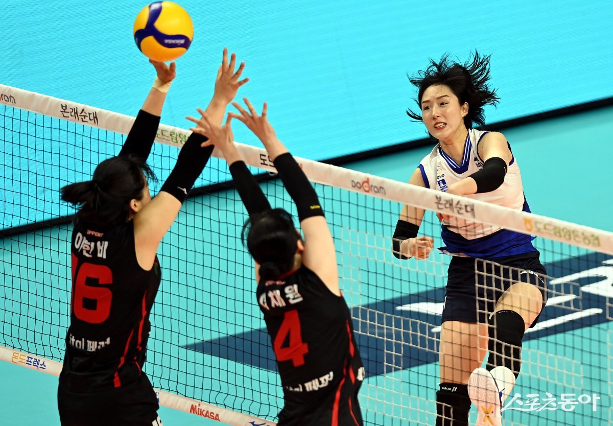 31일 경북 구미시 박정희체육관에서 ‘2023 구미-도드람컵 프로배구대회’ 수원 현대건설과 광주 페퍼저축은행의 여자부 경기가 열렸다. 현대건설 황연주가 페퍼저축은행 블로커를 피해 스파이크를 날리고 있다.