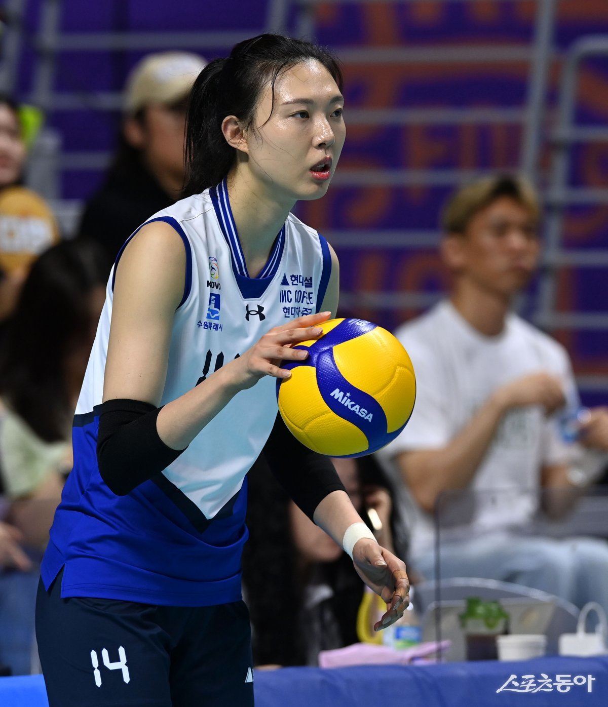 31일 경북 구미시 박정희체육관에서 ‘2023 구미-도드람컵 프로배구대회’ 수원 현대건설과 광주 페퍼저축은행의 여자부 경기가 열렸다. 현대건설 양효진이 올 시즌부터 새롭게 바뀐 미카사 배구공으로 서브를 준비하고 있다.