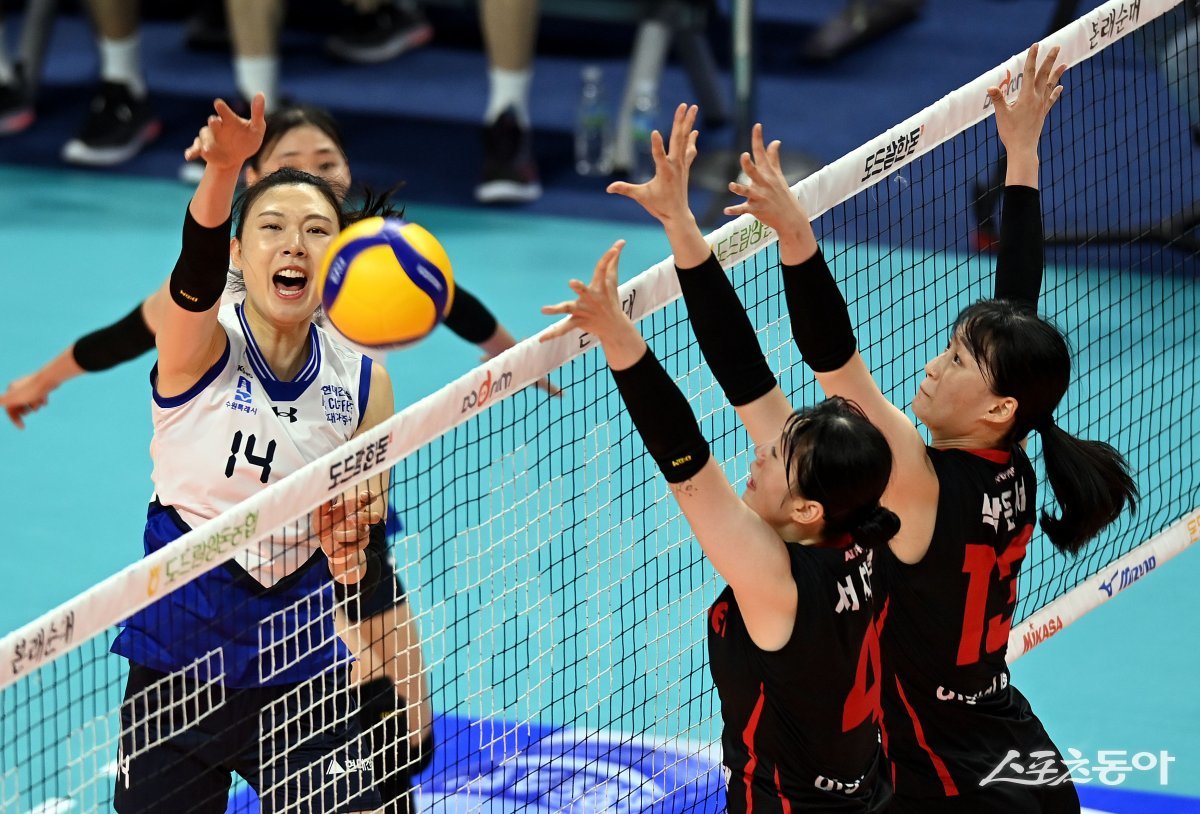 31일 경북 구미시 박정희체육관에서 ‘2023 구미-도드람컵 프로배구대회’ 수원 현대건설과 광주 페퍼저축은행의 여자부 경기가 열렸다. 현대건설 양효진이 페퍼저축은행 블로커를 피해 공격을 펼치고 있다.